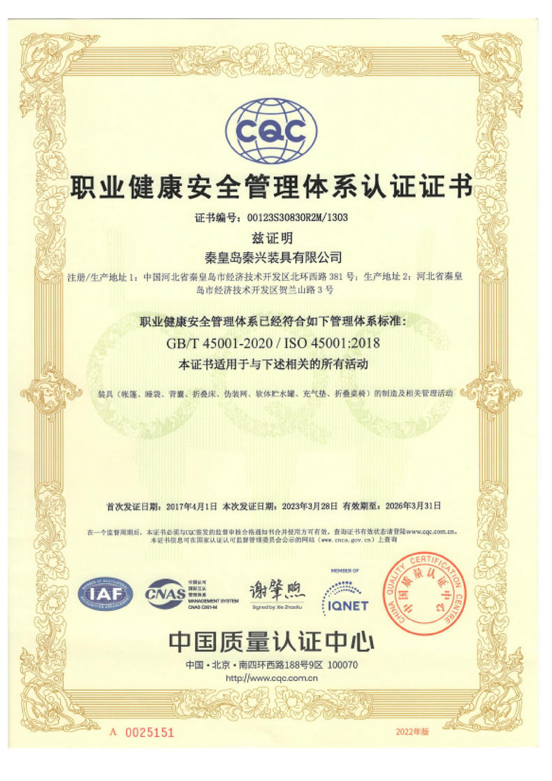 秦皇島秦興裝具有限公司有限公司源于我國第3524工廠,創(chuàng)建于2005年,占地面積30畝,是一家致力于研究,發(fā)展,制造和銷售為一體的綜合性裝具及紡織服裝加工生產(chǎn)企業(yè),我們的主要產(chǎn)品有單、棉帳篷,民用帳篷,旅游帳篷集各種機工產(chǎn)品等。